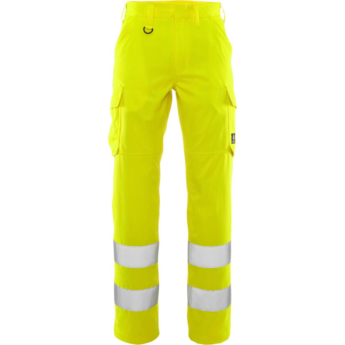 Fluorescerande och med reflexer. Har en vattenavvisande yta. Trenålsstickningar på benen och i grenen. Byxbenen är ergonomiskt formade. Gylf med blixtlås. D-ring. Fickor på framstycket. Bakfickor med lock. Benfickor med lock och dolda tryckknappar. Innerbenslängden kan ökas med 3 cm genom att ta bort den invändiga röda sömmen vid foten.