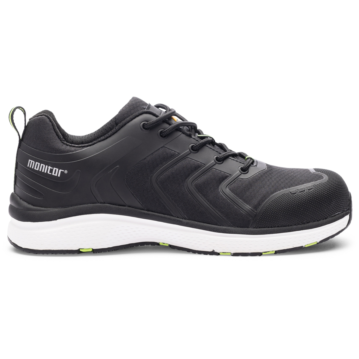 Monitor Graphic är vår nya serie med fjäderlätta skyddsskor för lager, industri och lättare bygg och anläggningsarbeten. Artikel Courage är en extremt lätt S3 skyddssko med en vikt på 450 gram. Skon har en aluminium tåhätta och ett Pantzar APT spikskydd. Ovandelen är tillverkad i Ripstop med TPU förstärkningar i tå och häl. Snörningen är klassisk och har en plös med bälg för att hindra smuts att ta sig in i skon. Trots sin extrema lätthet och smidiga utseende är passformen bred. Yttersulan är tillverkad i gummi med en mellansula i EVA. Innersulan är Monitors Pro Support sula som är helt återvunnen av PET flaskor.