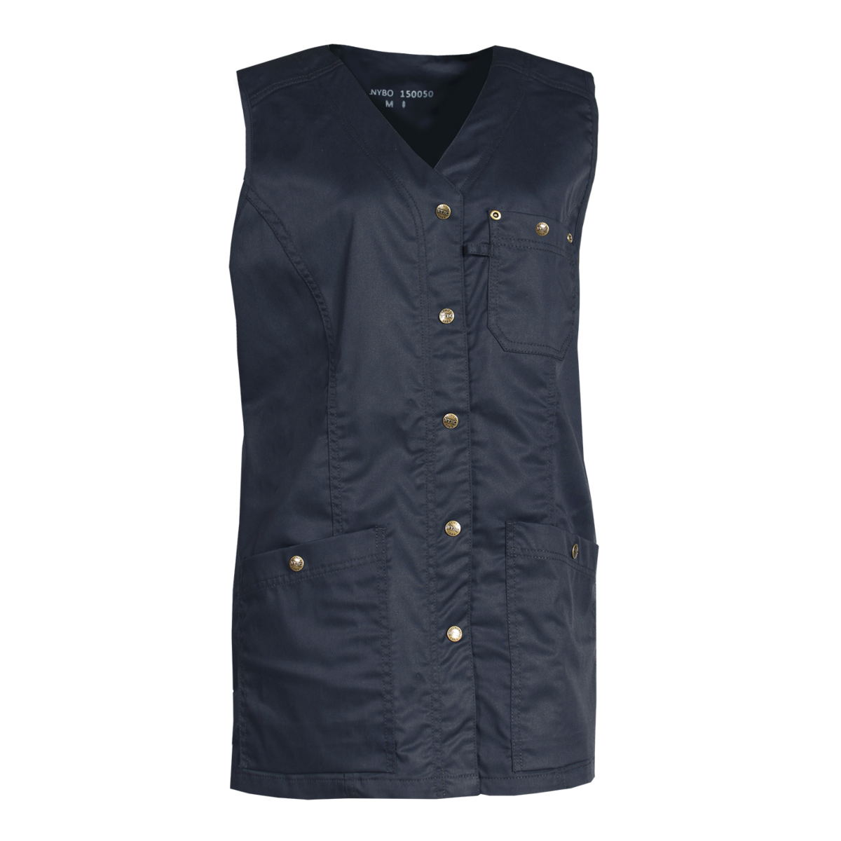 Snygg damväst med tryckknappsstängning, 2 stängbara höftfickor och en bröstficka. Västen har tryckknappsstängning och är passande för industritvätt