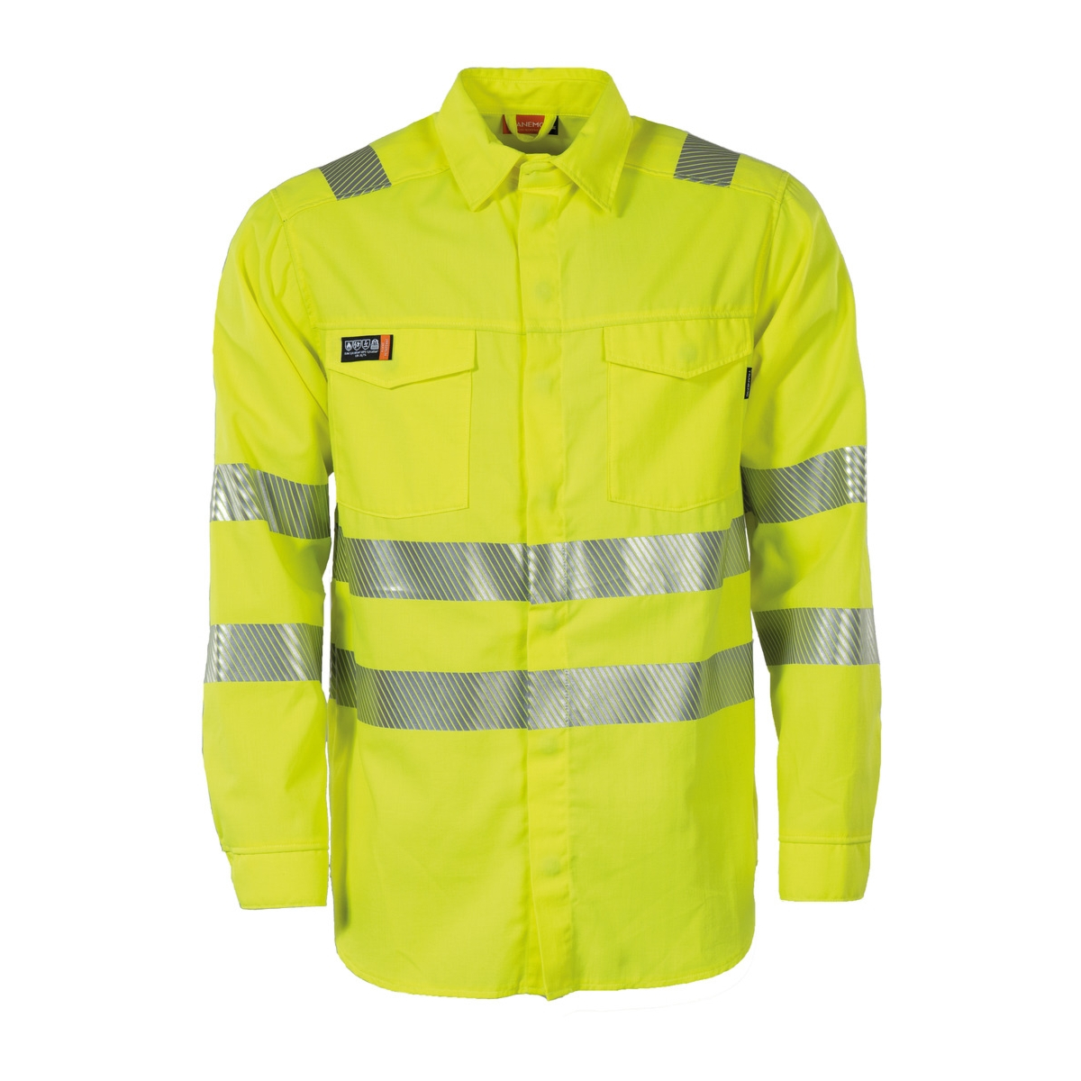 Non-Metal and Inherent Flame Retardant Hi-Vis shirt with two chest pockets. The shirt is sewn in a light and easy twill and has soft heat sealed reflective stripes.