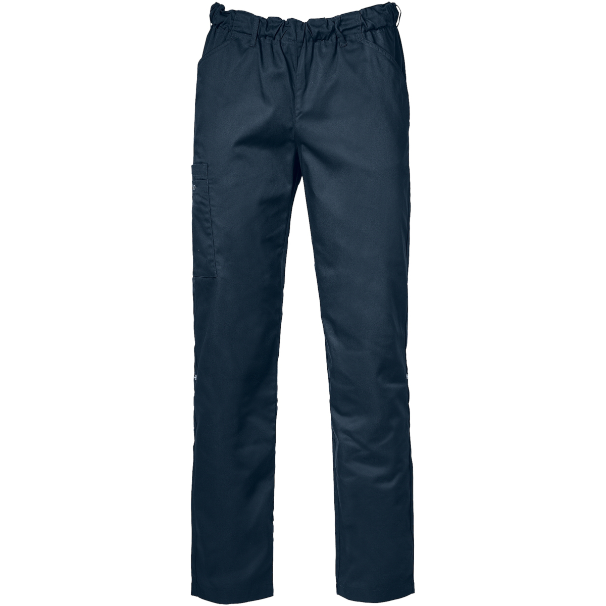 Rymlig unisexbyxa med resår och dragsko i midja. Benslejf för enkel justering till highwaterbyxa för varmare miljöer. Rymliga infällda fickor fram och dubbel benficka med dubbla pennfickor och ringtryckknapp på den ena fickan. Innerbenslängd 84 cm i storlek M.