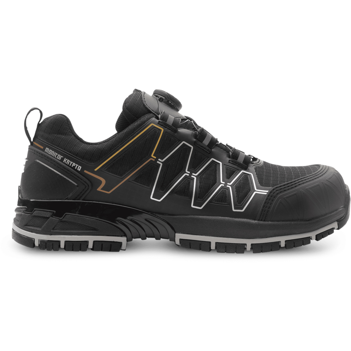Monitor Krypto är en skyddssko i sport utförande som inte bara ser ut som sportsko utan också har passform och komfort som en sådan. Ovandelen är försedd med BOA® Fit System för snabb och enkel snörning med en precis passform. Ovandelen har ett vattentätt Monitex membran. Skon har dessutom ett slitstarkt Ribstop material och på tå och häl ett kraftigare TPU skydd för att ytterligare förstärka skon. Yttersulan är Monitors nya SIGMA som har en yttersula i gummi med ett mönster som borgar för ett bra grepp på de flesta underlag. Den har sedan en mellansula i dämpande EVA med en kraftig torsionsgaffel för att öka stabiliteten ytterligare. Tåhättan är bred och är tillverkad i aluminium. Skon har också Monitors SS2.0 innersula.