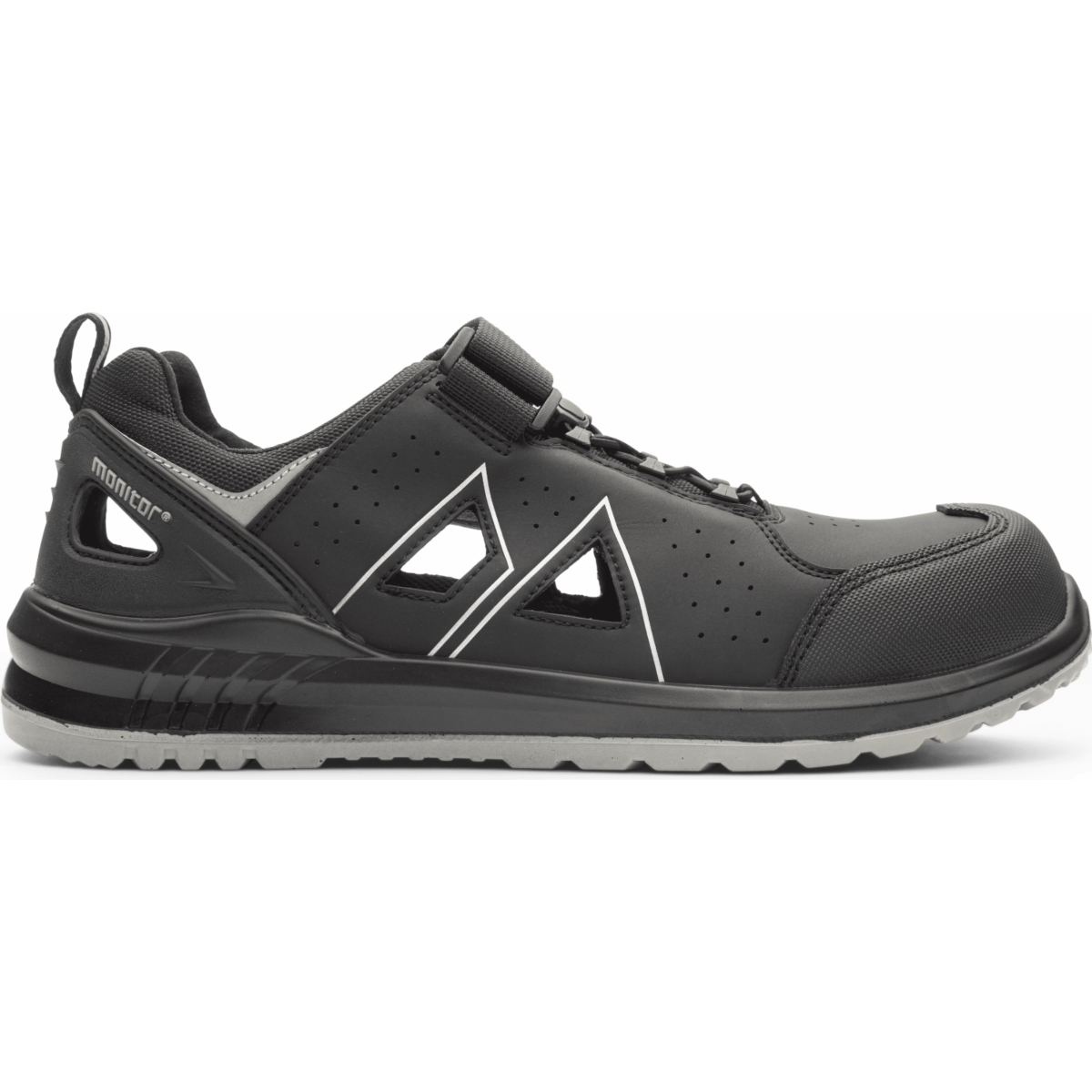Monitor Radar är ytterligare en ny medlem i Dynamic familjen! Radar är en ny sportig skyddssko tillverkad med insprutnings teknik och som har en ventilerad ovandel i microfiber med stora ventilerade fält på båda sidorna. Yttersulan är tillverkad i 2 densitets Polyuretan där mellansulan har en mjukhet på 50 Shore A och ger tillsammans med Monitors SS 2.0 innersula en fantastiskt komfortabel och dämpad sko, trots sin slimmade yttersula. Radar har en ny typ av snörning där vi kombinerat det klassiska kardborrbandet med en komfortlösning. Skon har en inredning i fuktabsorberande textil. Tåhättan är tillverkad i komposit och spikskyddet är ett mjukt APT skydd.
