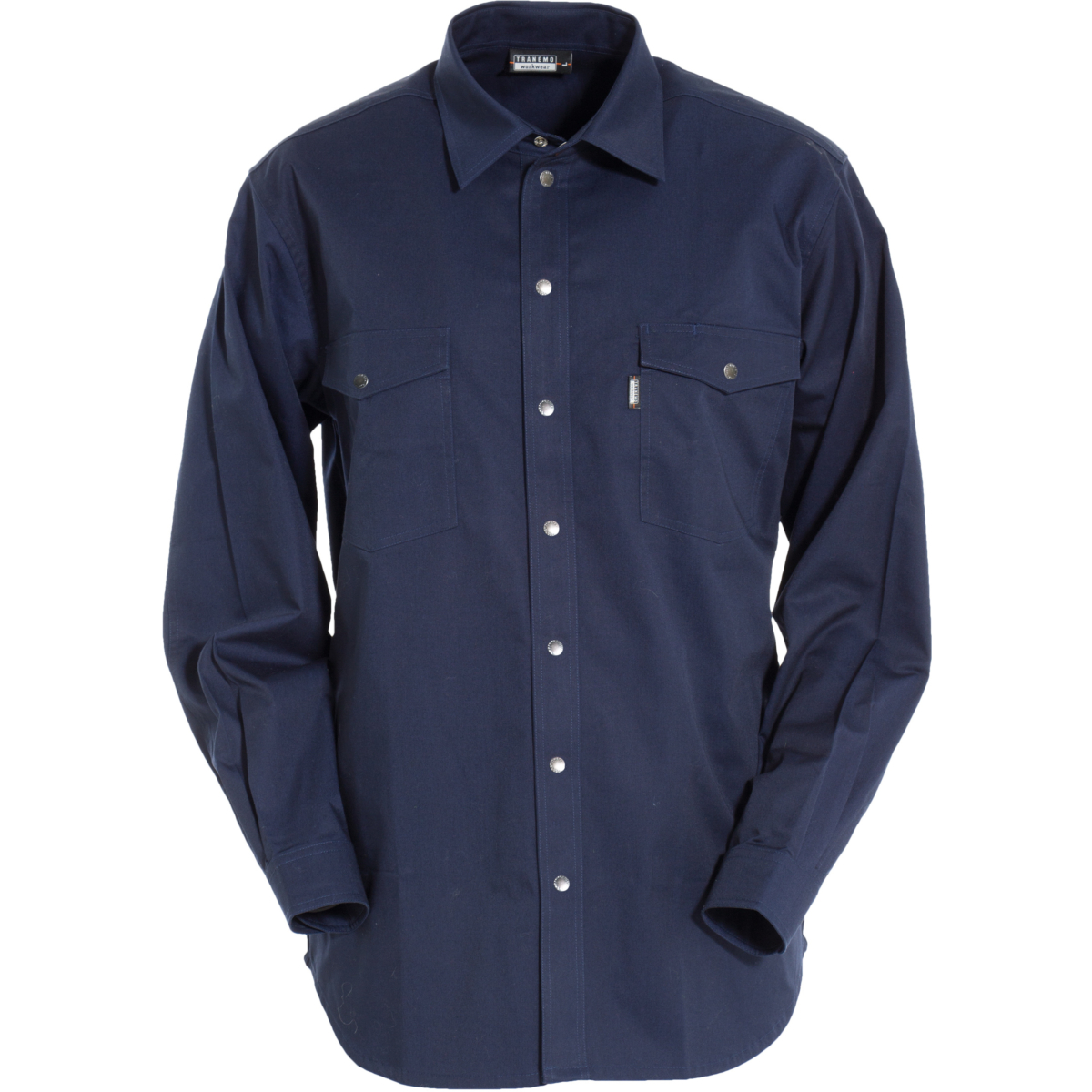 Långärmad skjorta i tunn bomull/polyestertwill. Tryckknappar framtill. Bröstfickor med ficklock, varav vänster med öppning för penna.