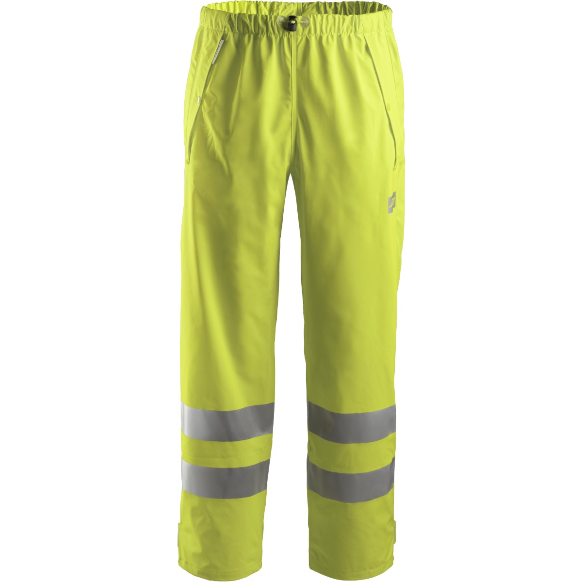 Helt vattentät regnbyxa med hög synlighet. Tillverkad av stretchigt PU-belagt tyg med svetsade sömmar för att garantera en 100% torr och bekväm arbetsdag. EN 343, EN 20471, Klass 2.